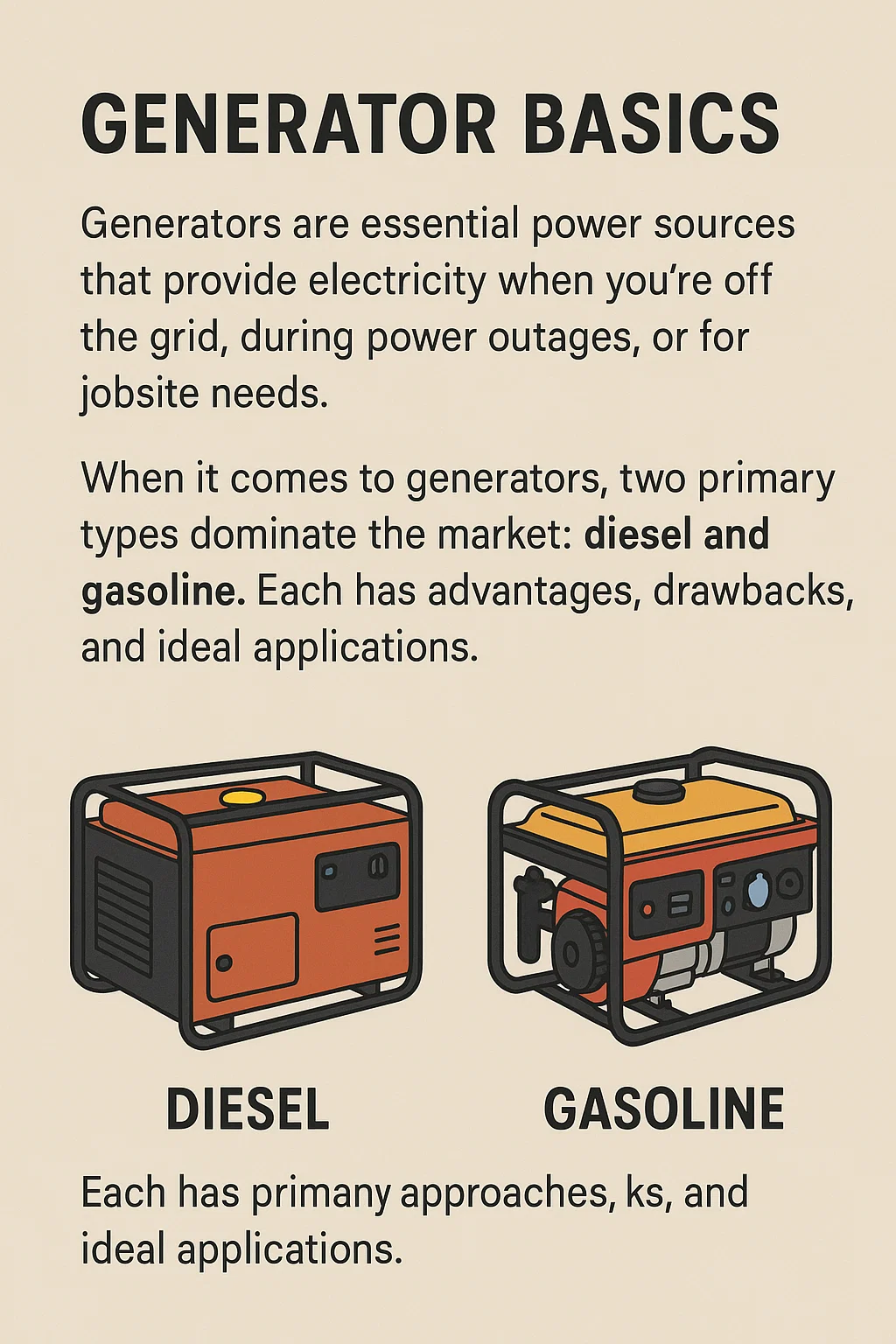 Diesel generatorer : Diesel er også allment tilgjengelig, spesielt i landlige områder og for kommersiell bruk. Imidlertid selges diesel ofte på større bensinstasjoner eller lastebilstopp, noe som kanskje ikke er like praktisk i mer urbane eller boligmiljøer.